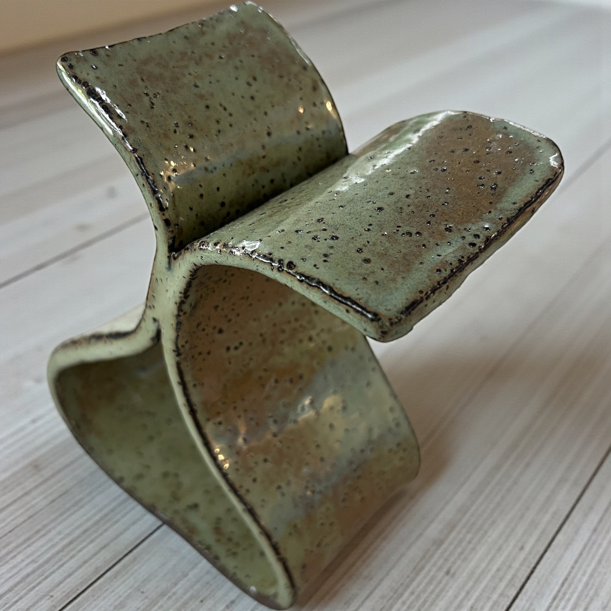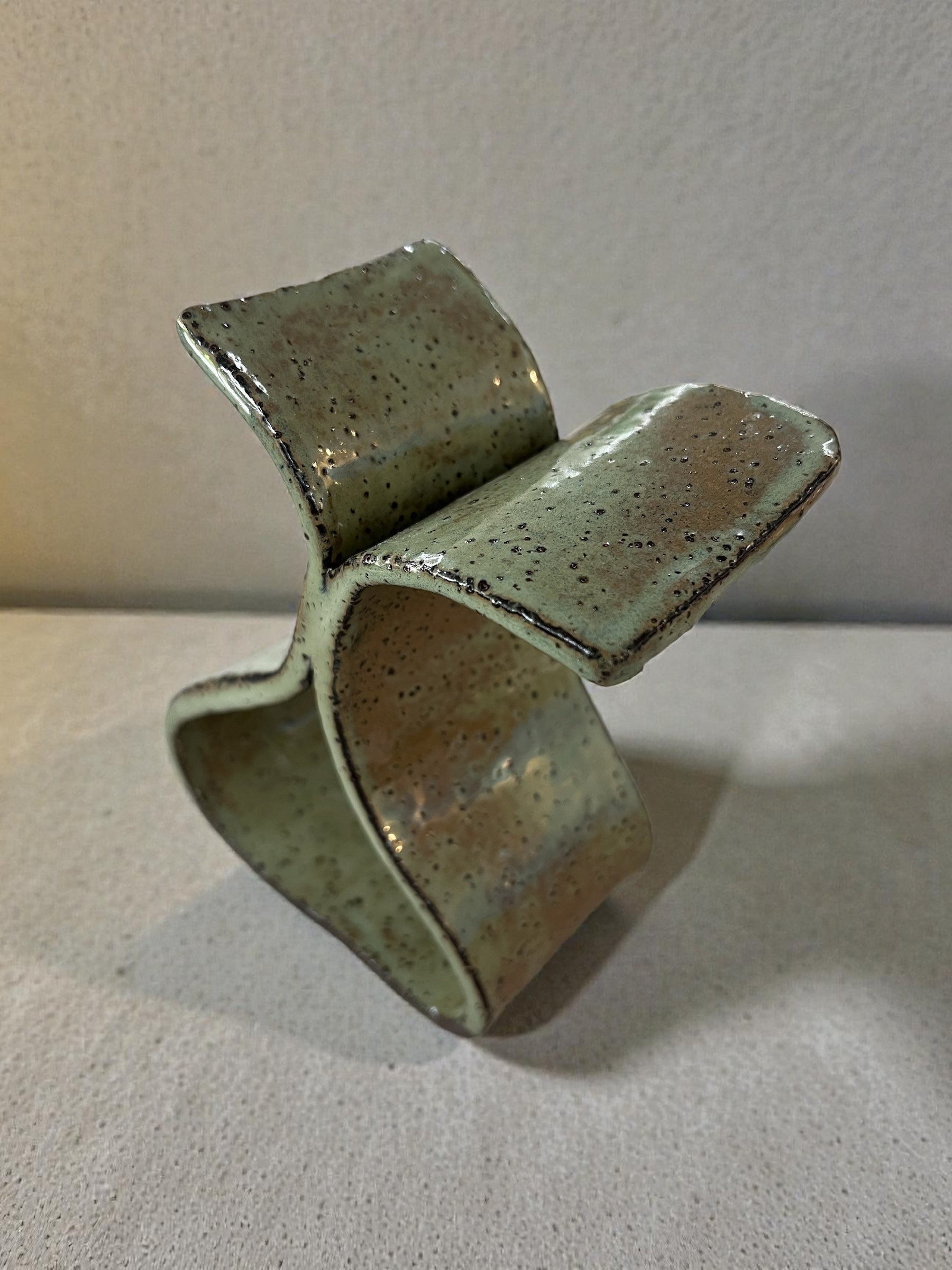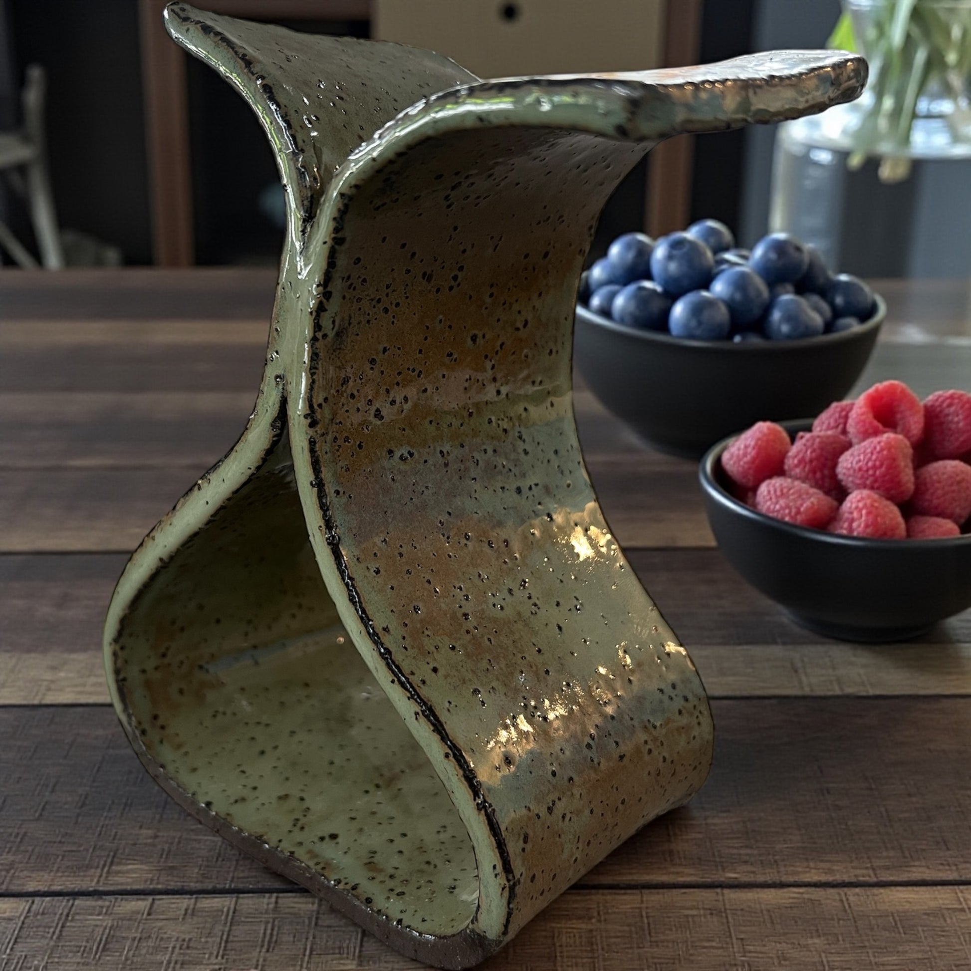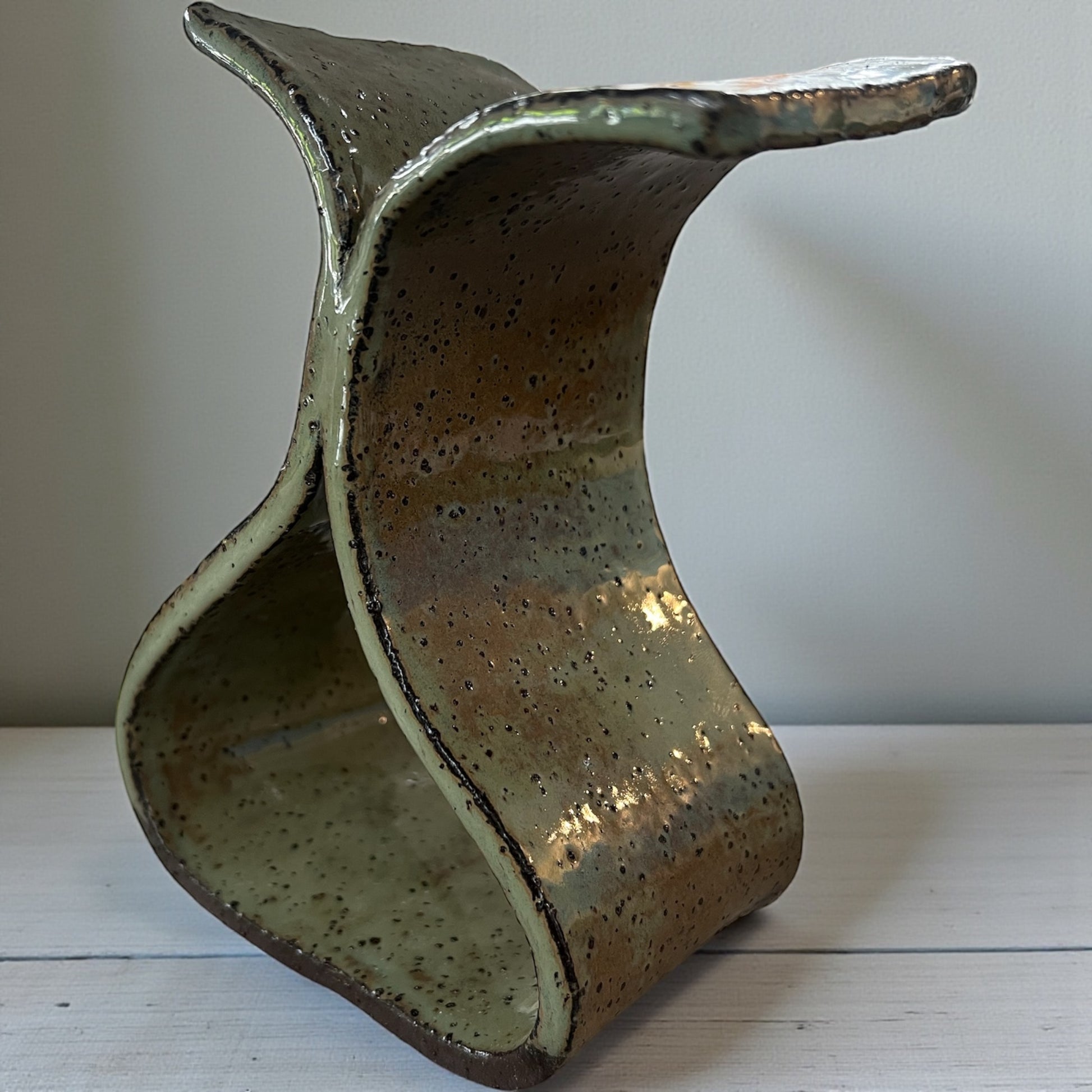 A sculptural vessel defined by tension and flow. Arc I explores balance through opposing curves, finished in a softly mottled glaze that shifts between earth, moss, and ash. Each surface records the movement of the hand — intentional, imperfect, and unapologetically raw.